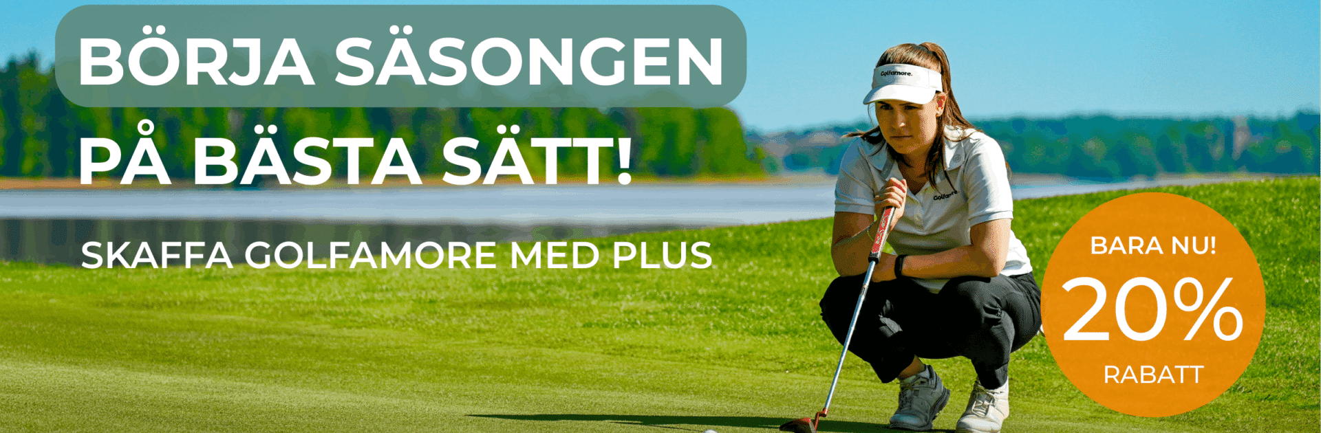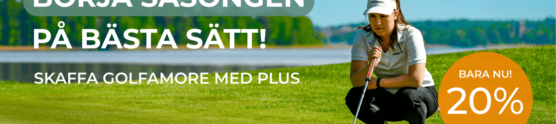 Sista rabatten inför säsongen! Passa på, just nu får du 20 % rabatt på Golfamore med PLUS. Med PLUS får du ännu fler möjligheter att njuta av golf till halv greenfee på utvalda tider. Det betyder att du får ännu mer golf för pengarna – hela säsongen lång.